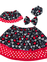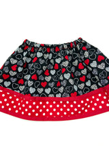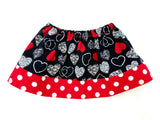 This adorable print is a double layer skirt, paired with a bold red and white polkadot.The soft and adorable scribble chalkboard print is sprinkled with red hearts. Perfect for your little valentine!
