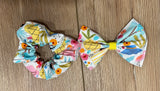 The Summer Fun hair bow or scrunchy will add a stylish and laid back vibe to any Summer activity or backyard barbecue. The fabric is 100% cotton and features a vibrant print of pineapples, sunglasses, beach umbrellas, flamingos and more.