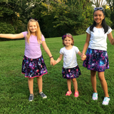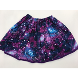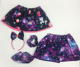 Our Galaxy Hair Bows and Scrunchies are out of this world and a hit among all ages! Perfect for school or a trip to the science center. Made from 100% cotton, this hair accessory is several shades of purple, blue, and pink. It will pair perfectly with jeans or our matching Galaxy Skirt! The sparkle on the fabric is a light amount of glitter that stays on the fabric, not on your hand. Available with or without planets and your choice of rose pink or purple trim, you will not be disappointed.