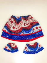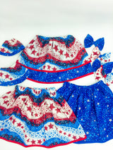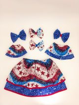 Feeling patriotic? Then look no further than these adorable glitter stars. The red, white, and blue never looked so good than it does with a little glitter. Choose a red, white, and blue stars or all blue stars in a double or single layer skirt, doll skirt, hair bow, and scrunchy for the perfect summer picnic outfit.