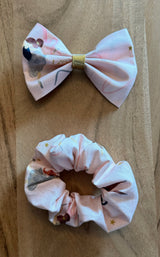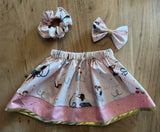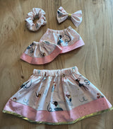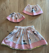 This pretty in pink single layer skirt is soft 100% cotton fabric. Print features ballerina friends with gold writing and gold stars in soft pastel colors. Paired with a deeper shade of pink with gold and white stars.