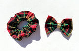This adorable black plaid print features black, red, green, and metallic plaid to go with all of your holiday outfits. Choose a scrunchy or a hair bow with clip or headband.