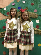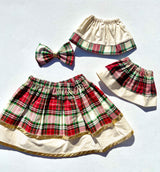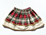 This adorable cream plaid skirt is in a double or single layer. The double layer skirt features the cream, red, and green plaid on top with the second layer of green and gold fabric underneath with gold metallic trim. The single layer is the same beautiful plaid on top with cream and gold fabric as a trim with the gold metallic trim.