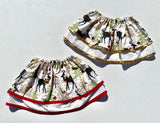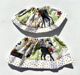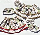 This beautiful holiday reindeer will add sparkle and shine to your wardrobe! Paired with an under skirt in a beautiful green and gold dot print you will love to dress up in this special skirt. Choose your favorite trim too, from a deep red or gold.