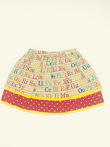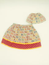 This 100% cotton ABC pattern skirt is paired with a hot pink polkadot double layer and cheerful yellow trim.