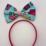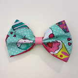 All of our hair bows are designed to be interchangeable with a clip or a headband. The hair bow is approximately 4” wide by 6” long and is made from 100% cotton fabric. The cupcake print features vibrant berry pink, light pink, turquoise, and mint cupcakes.