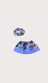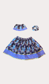 The Norway skirt and hair accessories have an adorable print with purple sparkle and gold trim. You will love how cute it is!